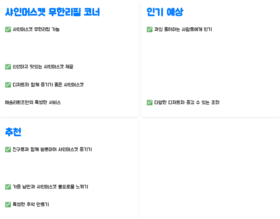 이 기회를 놓치지 마시고, 친구들과 함께 애슐리퀸즈에 방문하여 풍성한 샤인머스캣을 만끽해보세요. 가을의 낭만과 함께 샤인머스캣의 풍요로움을 느낄 수 있는 최고의 경험이 될 것입니다. 애슐리퀸즈 샤인머스캣 무한리필 코너는 단순한 과일 제공을 넘어, 고객들에게 특별한 추억을 선사하는 공간이 될 것입니다.