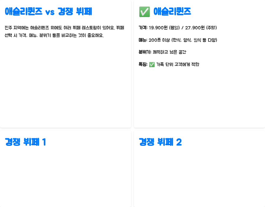 진주 지역에는 애슐리퀸즈 외에도 여러 뷔페 레스토랑이 있습니다. 각 뷔페 레스토랑의 가격과 메뉴 구성, 분위기를 비교하여 어떤 곳이 나에게 더 적합한지 선택하는 것이 중요합니다. 아래 표는 애슐리퀸즈와 다른 뷔페 레스토랑을 비교 분석한 내용입니다. (해당 정보는 추가적인 정보 수집 후 작성될 예정입니다. 진주 지역의 경쟁 뷔페에 대한 정보를 제공해주시면 더욱 정확한 비교 분석을 제공할 수 있습니다.)