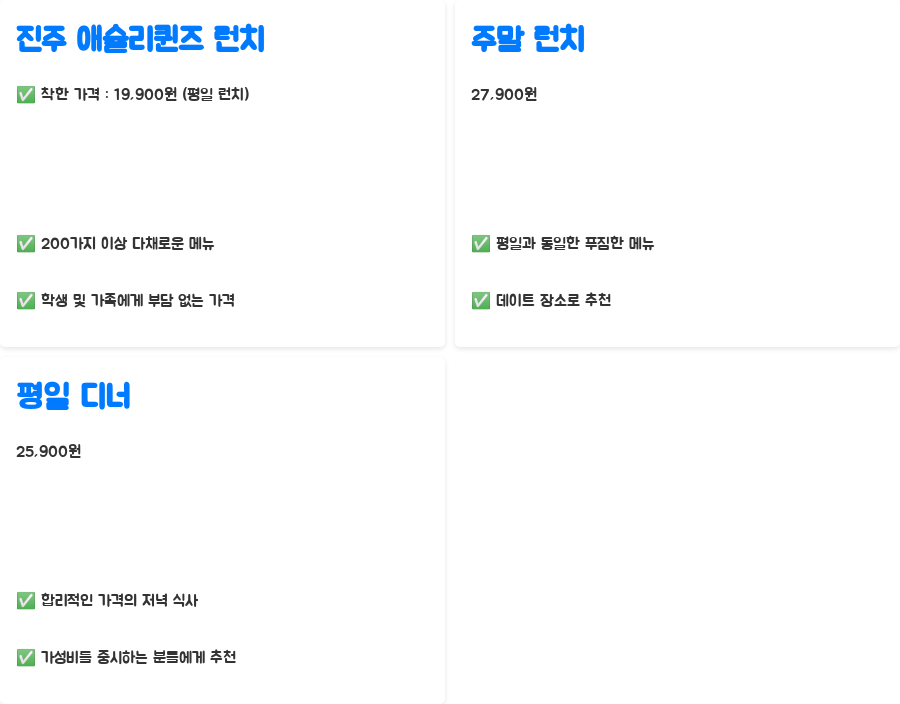 애슐리퀸즈 진주점의 가장 큰 매력은 바로 착한 가격입니다. 특히, 평일 런치의 경우 19,900원이라는 놀라운 가격에 200가지가 넘는 다채로운 메뉴를 즐길 수 있습니다. 주머니 사정이 가벼운 학생들에게도, 부담 없는 가격으로 푸짐한 식사를 즐길 수 있는 기회입니다. 점심시간을 이용해 친구들과 혹은 가족과 함께 맛있는 음식을 즐기며 즐거운 시간을 보낼 수 있습니다.