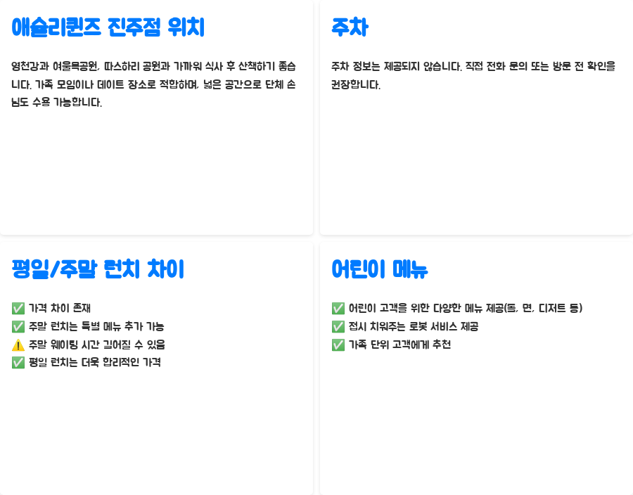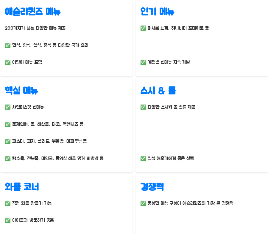 | 애슐리퀸즈 | 19,900원 (평일) / 27,900원 (주말) | 200종 이상, 한식, 양식, 일식 등 다양한 메뉴 | 쾌적하고 넓은 공간 | 가족 단위 고객에게 적합 |