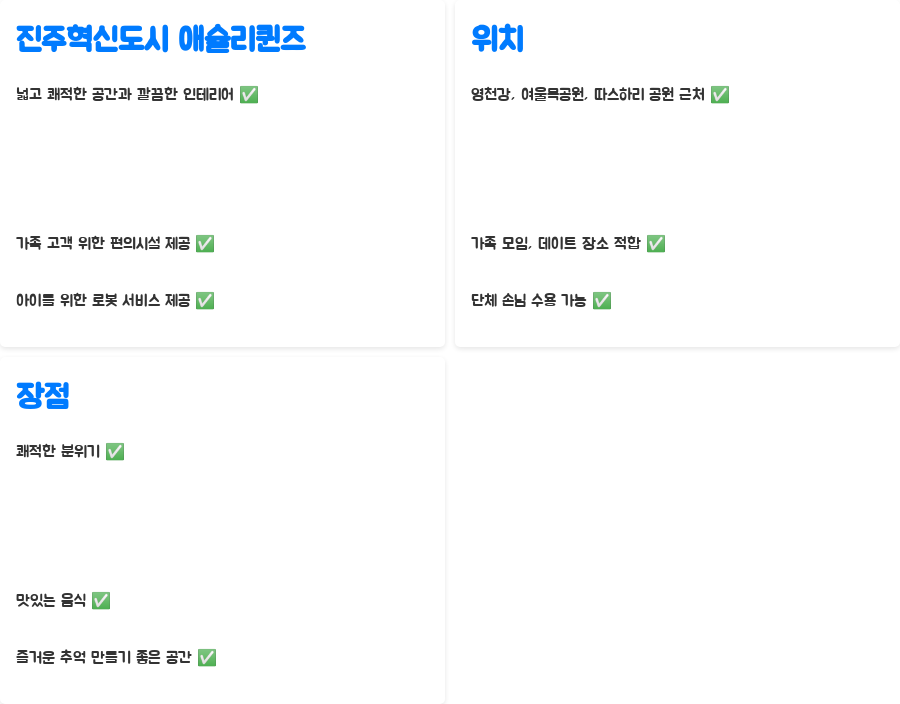 쾌적한 분위기와 맛있는 음식은 진주혁신도시에서 최고의 외식 장소를 찾는 분들에게 완벽한 선택이 될 것입니다. 애슐리퀸즈는 단순히 식사를 하는 공간을 넘어, 즐거운 추억을 만들 수 있는 공간으로 자리매김했습니다. 가족과 친구들과 함께 행복한 시간을 보내고 싶다면, 진주 애슐리퀸즈를 방문해보세요.
