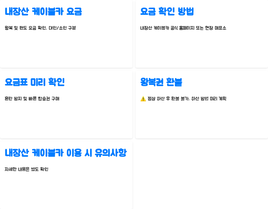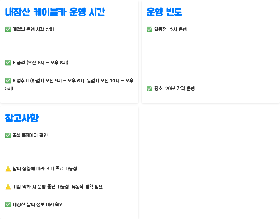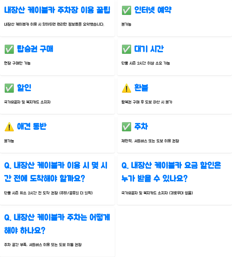 내장산 케이블카 이용 시 꼭 알아두어야 할 사항들을 비교표로 정리했습니다. 미리 확인하고 방문하면 더욱 편리한 여행이 될 것입니다.