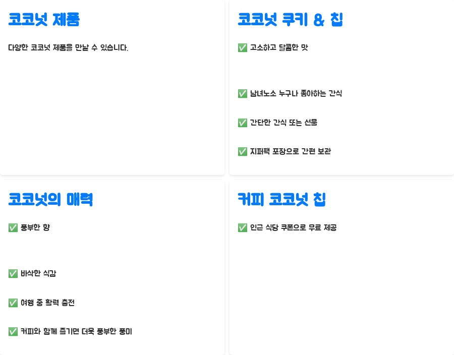 펑리수 외에도 남프엉에서는 다양한 코코넛 제품을 만날 수 있습니다. 코코넛 쿠키와 코코넛 칩은 고소하고 달콤한 맛으로 남녀노소 누구나 좋아할 만한 간식입니다. 여행 중 간단한 간식으로, 또는 지인들에게 나눠줄 작은 선물로도 제격이죠. 간편하게 보관할 수 있는 지퍼팩 포장은 여행의 편리성을 더해줍니다. 코코넛의 풍부한 향과 바삭한 식감은 여행 중 지친 몸과 마음에 활력을 불어넣어 줄 거예요. 커피와 함께 즐기면 더욱 풍부한 풍미를 느낄 수 있답니다. 특히, 커피 코코넛 칩은 인근 식당 쿠폰으로 무료로 받을 수 있는 기회도 있다고 하니 놓치지 마세요!