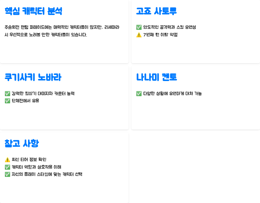 | 목표 캐릭터 | 고죠 사토루, 쿠기사키 노바라, 나나미 켄토 (최신 티어 정보 확인 필수) |