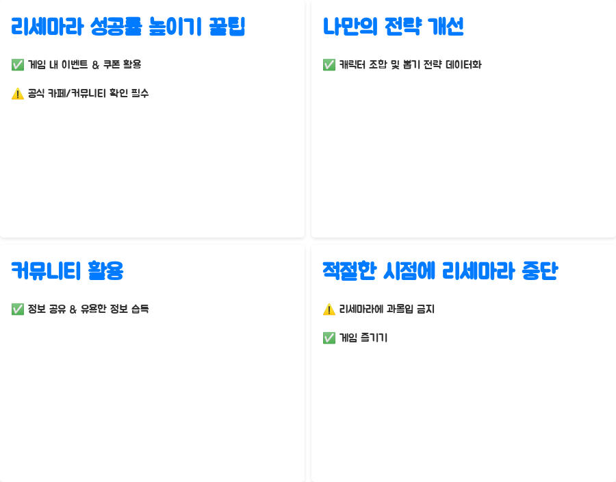 또한, 리세마라 과정에서 얻은 경험을 바탕으로 자신의 전략을 개선해 나가는 것도 중요합니다. 어떤 캐릭터 조합이 효율적인지, 어떤 뽑기 전략이 성공률을 높이는지 등의 데이터를 축적하면 다음 리세마라 시도에 큰 도움이 될 것입니다.