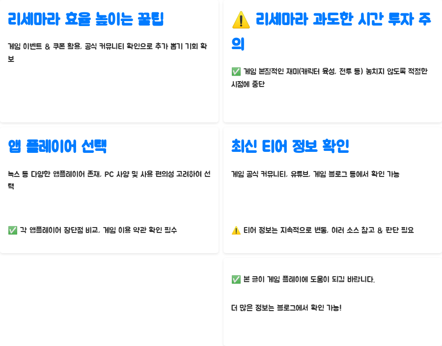 | 꿀팁 | 이벤트 및 쿠폰 코드 활용, 앱 플레이어 사용, 전략 개선 및 커뮤니티 활용 |
