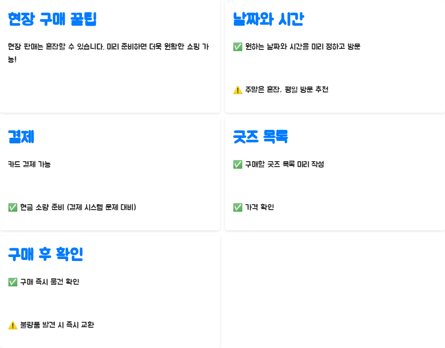 | 꿀팁 | 미리 시간 계획, 현금 소액 준비, 구매 목록 작성, 불량품 즉시 확인 |