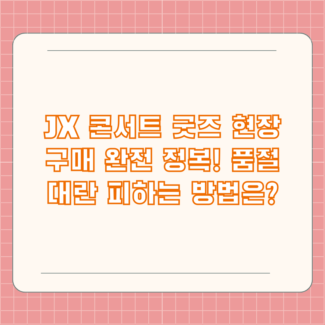 JX 콘서트 현장에서 굿즈 구매를 계획 중이신가요? 혹시 긴 줄과 품절 대란에 대한 걱정은 없으신가요? 수많은 팬들이 기다리는 JX 2024 콘서트의 현장 판매는 그야말로 전쟁터와 같을 수 있습니다! 하지만 걱정 마세요. 오늘 저희는 JX 콘서트 현장 판매에 대한 모든 것을 파헤쳐, 여러분의 굿즈 쇼핑을 성공으로 이끌어 드리겠습니다. 현장 판매 일정과 꿀팁, 주의사항까지! 지금 바로 확인해보세요!