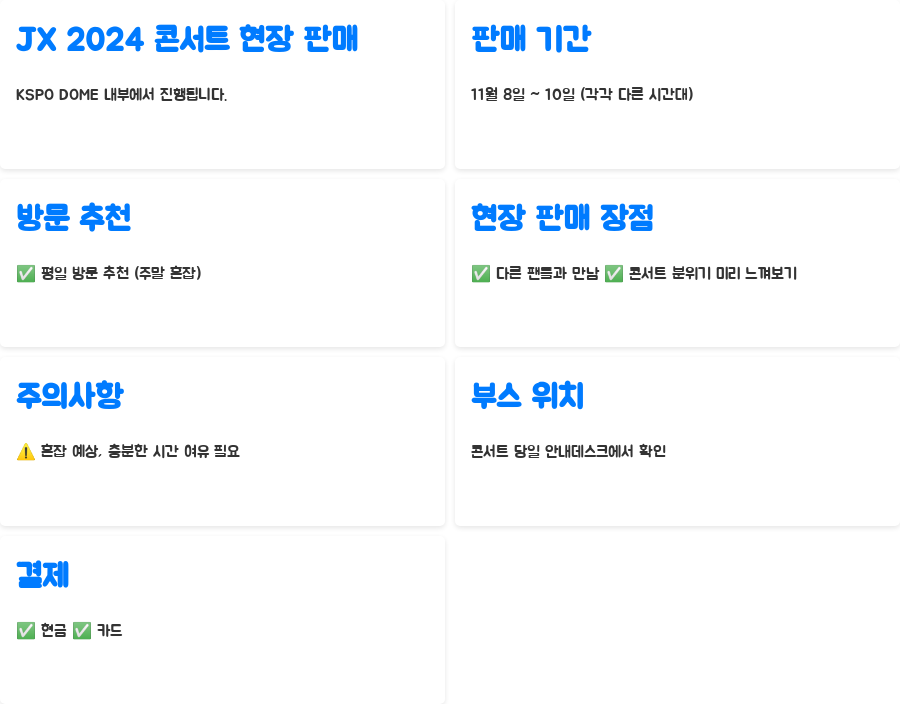 JX 2024 콘서트의 현장 판매는 KSPO DOME 내부에서 진행됩니다. 11월 8일부터 10일까지, 각각 다른 시간대에 열리니 본인에게 맞는 시간을 미리 확인하고 계획하는 것이 중요합니다. 특히 주말에는 사람이 훨씬 많을 것으로 예상되니, 평일에 방문하는 것을 추천합니다.