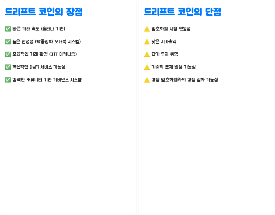 드리프트 코인은 매력적인 기술적 특징과 잠재력을 가지고 있지만, 위험 요소도 존재합니다. 아래 표는 드리프트 코인의 장점과 단점을 한눈에 보여줍니다.