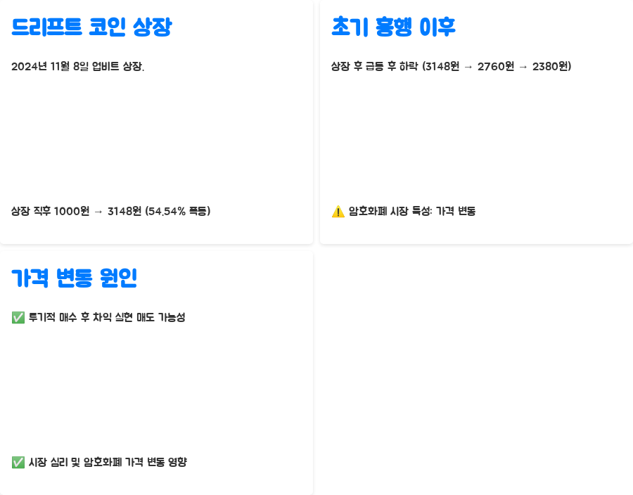 단순히 상장 후 투기적인 매수세가 몰렸다가 차익 실현 매도가 이루어진 것일 수도 있고, 시장 전반의 암호화폐 가격 변동과 시장 심리의 영향을 받았을 수도 있습니다. 드리프트 코인의 급등락은 단기간 투자자들의 심리를 잘 보여주는 사례입니다.