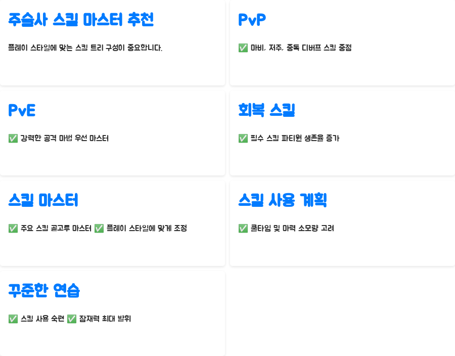 주술사 스킬 마스터를 위해서는 자신의 플레이 스타일에 맞는 스킬 트리를 구성하는 것이 중요합니다. PvP에 집중한다면 마비, 저주, 중독 등의 디버프 스킬을 중점적으로 마스터하고, PvE에 집중한다면 강력한 공격 마법을 우선적으로 마스터하는 것이 효율적입니다.