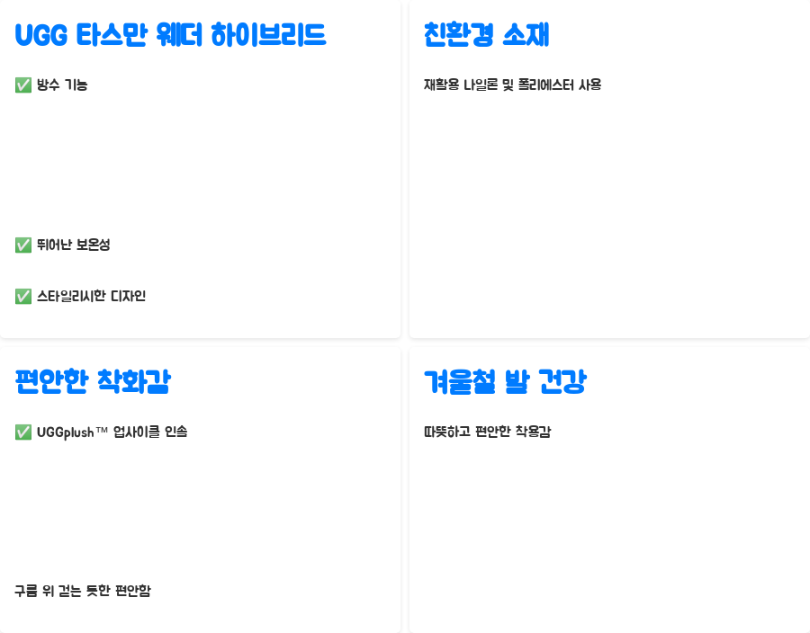| 보온성 | UGGplush™ 업사이클 인솔 | 뛰어난 보온성으로 추운 날씨에도 따뜻하게 유지 | |