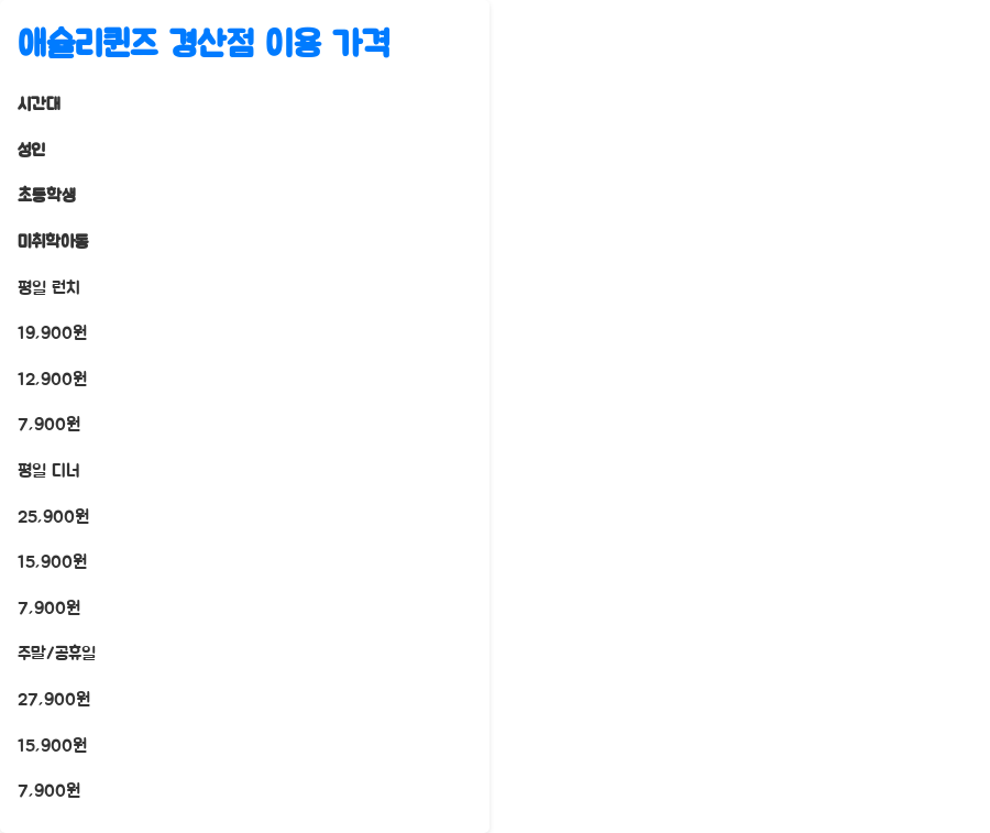 애슐리퀸즈 경산점은 경산 NC백화점 5층에 자리 잡고 있으며, 평일 런치의 경우 성인은 19,900원, 초등학생은 12,900원에 이용 가능합니다.