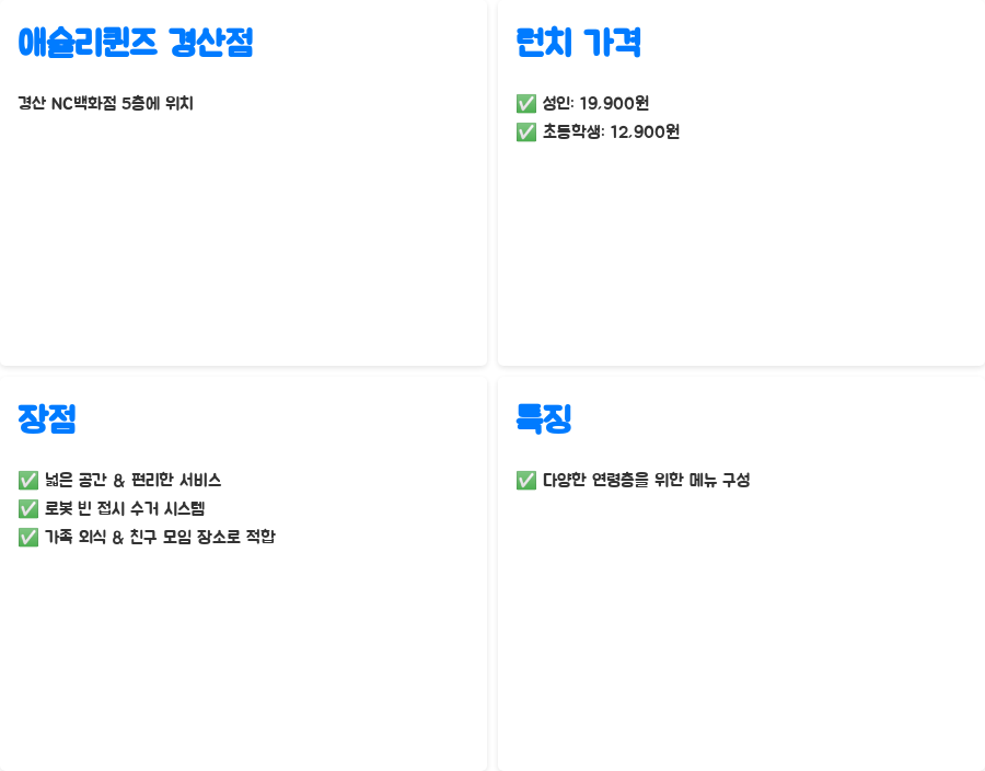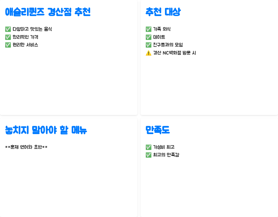 오늘 애슐리퀸즈 경산점에 대해 알아봤는데, 어떠셨나요?