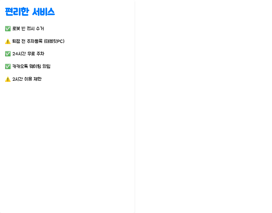 또한, 무료 주차를 위해서는 퇴점 전 매장 태블릿PC에서 직접 등록해야 한다는 점을 기억하세요.