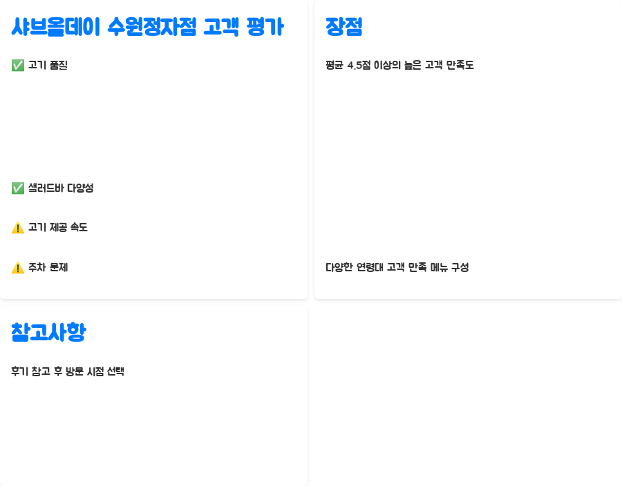 대부분의 고객들은 샤브올데이 수원정자점의 고기 품질과 샐러드바의 다양성에 대해 높은 점수를 주고 있습니다. 평균 4.5점 이상의 높은 고객 만족도는 이곳의 인기를 실감케 합니다.