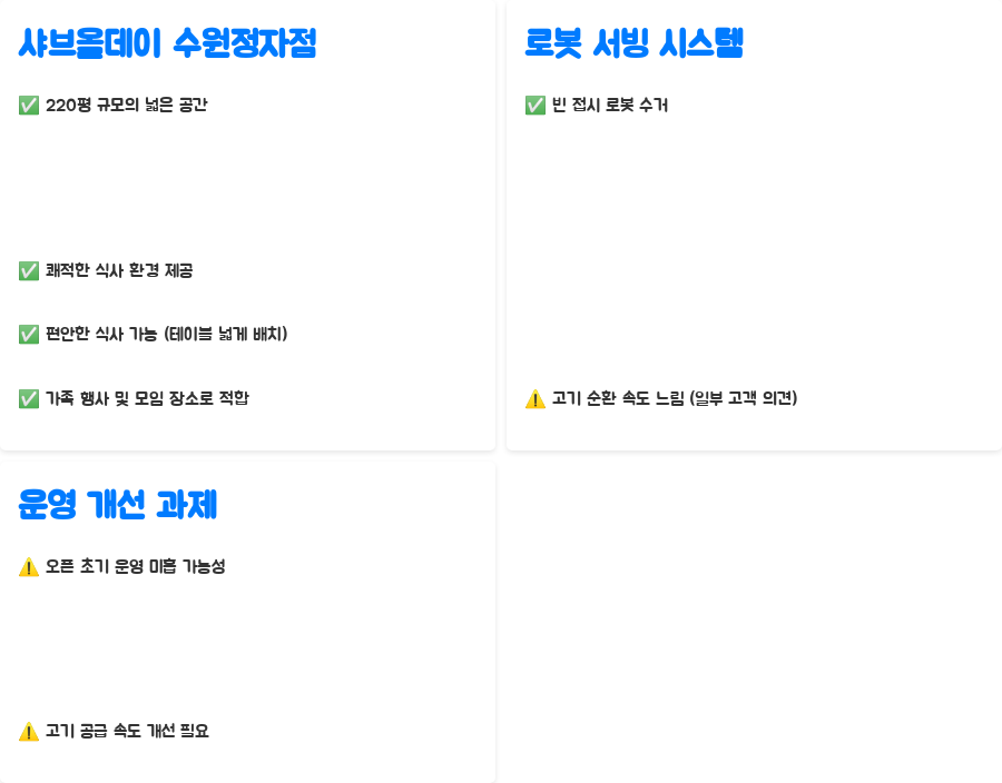 오늘 알아본 샤브올데이 수원정자점, 어떠셨나요? 넓은 공간과 다양한 메뉴는 분명 매력적이지만, 오픈 초기의 혼잡함과 일부 서비스 개선의 필요성은 분명히 존재합니다.