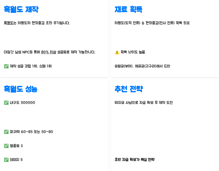 흑월도는 야월도와 현철중검을 조합하여 제작하는 강력한 무기입니다. 바람의나라 클래식 대장간의 남성 NPC를 통해 업그레이드가 가능하며, 성공률은 약 80% 이상으로 알려져 있습니다.