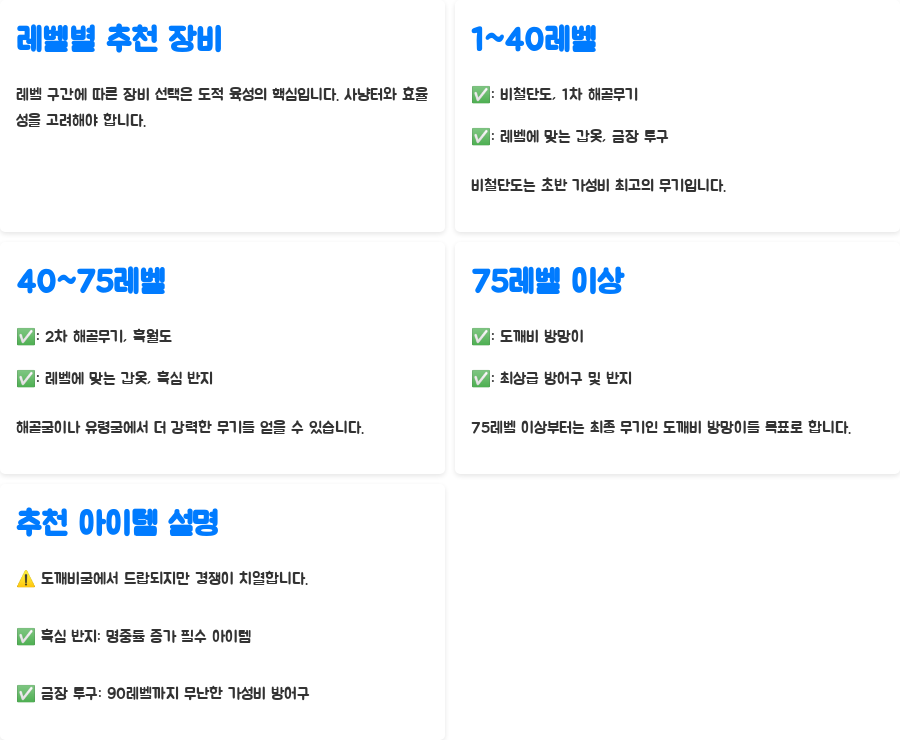 레벨 구간에 따른 장비 선택은 도적 육성의 핵심입니다. 단순히 레벨 제한만 고려하는 것이 아니라, 사냥터와 효율성을 고려하여 장비를 선택하는 것이 중요합니다. 다음 표는 레벨 구간별 추천 장비를 정리한 것입니다.