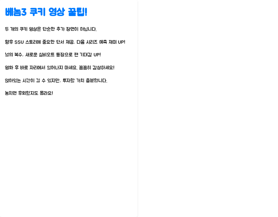 A1. 꼭 봐야 한다고 말씀드릴 수는 없지만, 향후 스토리 전개의 중요한 단서가 될 수 있으므로, 가능하다면 두 개의 쿠키 영상 모두 보시는 것을 추천드립니다.