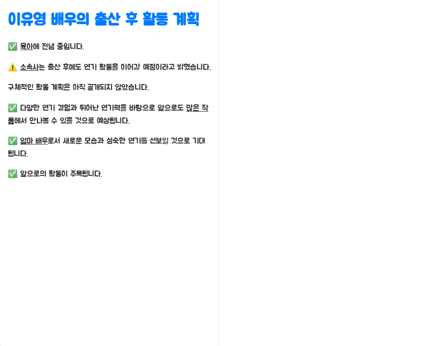 Q2. 이유영 배우의 출산 후 활동 계획은 어떻게 되나요?