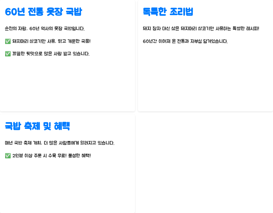 | 목표 | 지역 경제 활성화, 순천 웃장 국밥 홍보 |