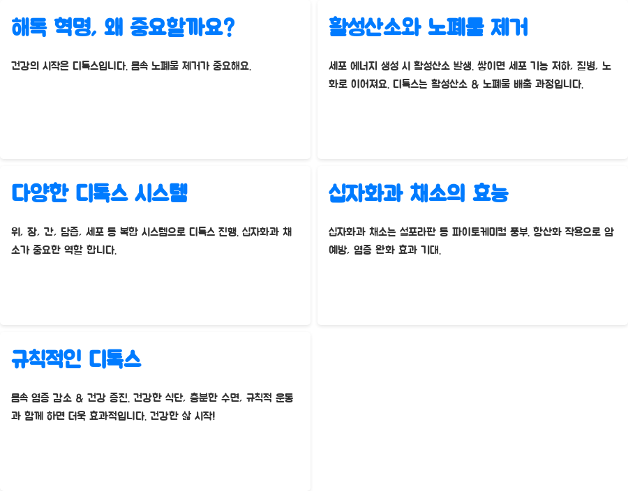 이 매연이 쌓이면 세포 기능 저하, 질병, 노화로 이어집니다. 디톡스는 이러한 활성산소와 노폐물을 배출하는 과정이며, 건강한 삶을 유지하는 데 필수적입니다.