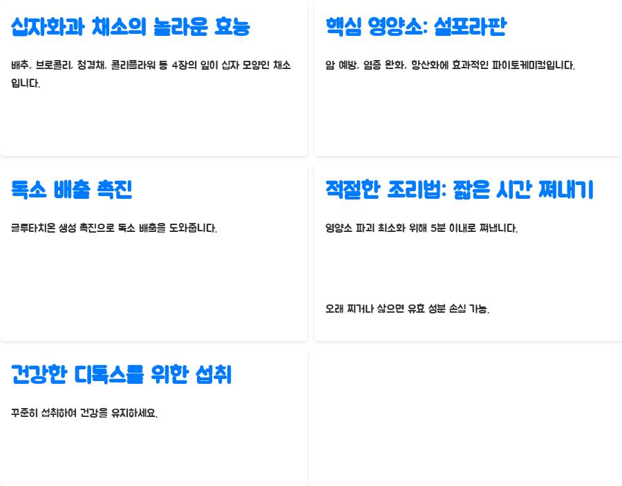 이 채소들은 설포라판이라는 특별한 파이토케미컬을 함유하고 있습니다. 설포라판은 암 예방과 염증 완화, 그리고 항산화 작용에 탁월한 효과를 발휘합니다.