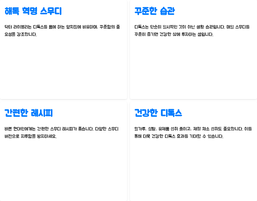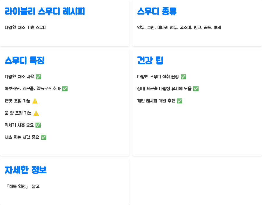 오늘은 닥터 라이블리의 『해독 혁명』과 '라이블리 스무디'에 대해 알아보았습니다. '몸에 하는 양치질'이라고 불리는 디톡스의 중요성과 간편하면서도 효과적인 스무디 레시피를 통해, 건강한 삶에 한 걸음 더 다가갈 수 있기를 바랍니다.