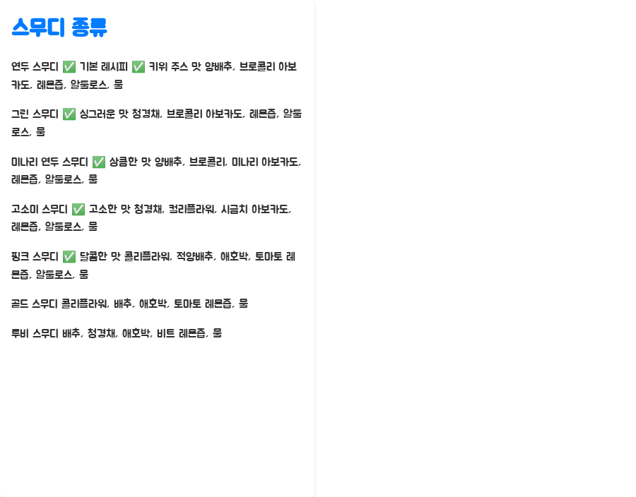 | 연두 스무디 | 양배추, 브로콜리 | 아보카도, 레몬즙, 알룰로스, 물 | 기본 레시피, 키위 주스 맛 |