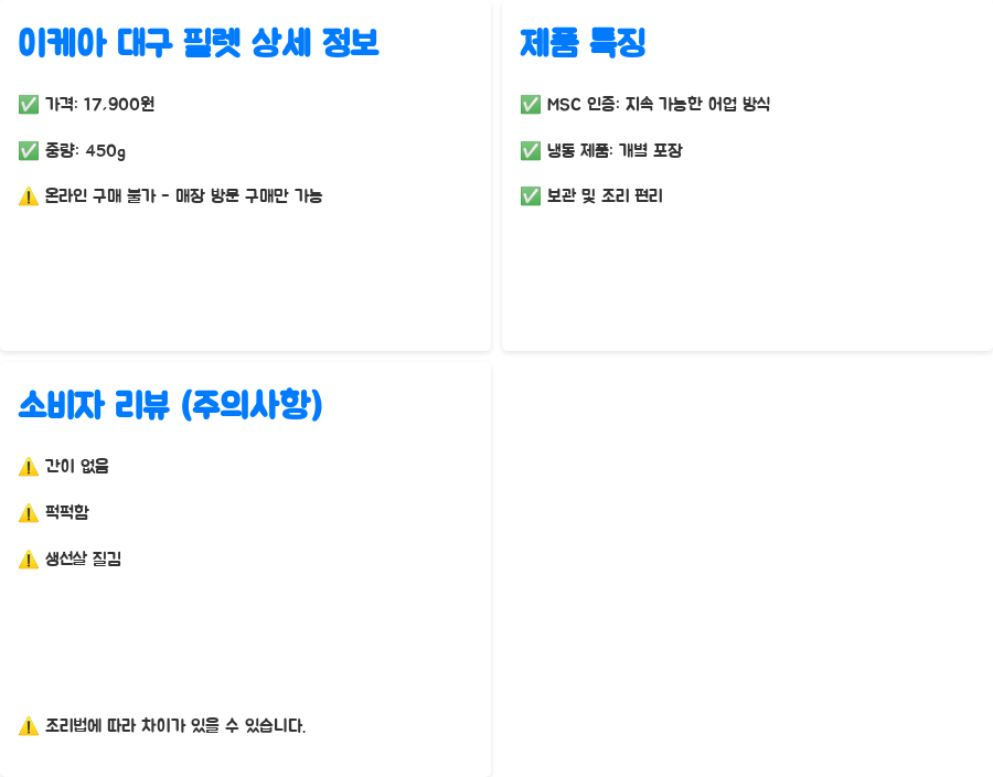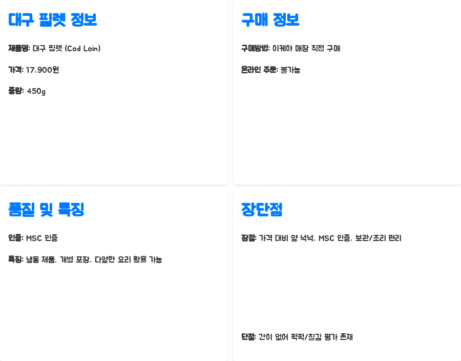 | 장점 | 가격 대비 양이 넉넉, MSC 인증, 보관 및 조리 편리 |