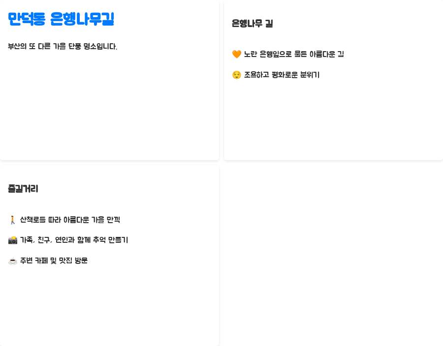 | 만덕동 은행나무길 | 조용하고 평화로운 분위기, 산책로 잘 조성 | 11월 중순~말 |