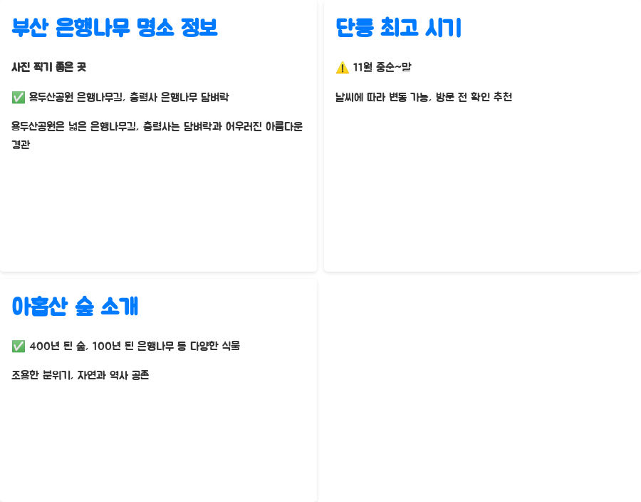 오늘은 부산에서 가을의 아름다움을 만끽할 수 있는 은행나무 명소들을 함께 살펴보았습니다.