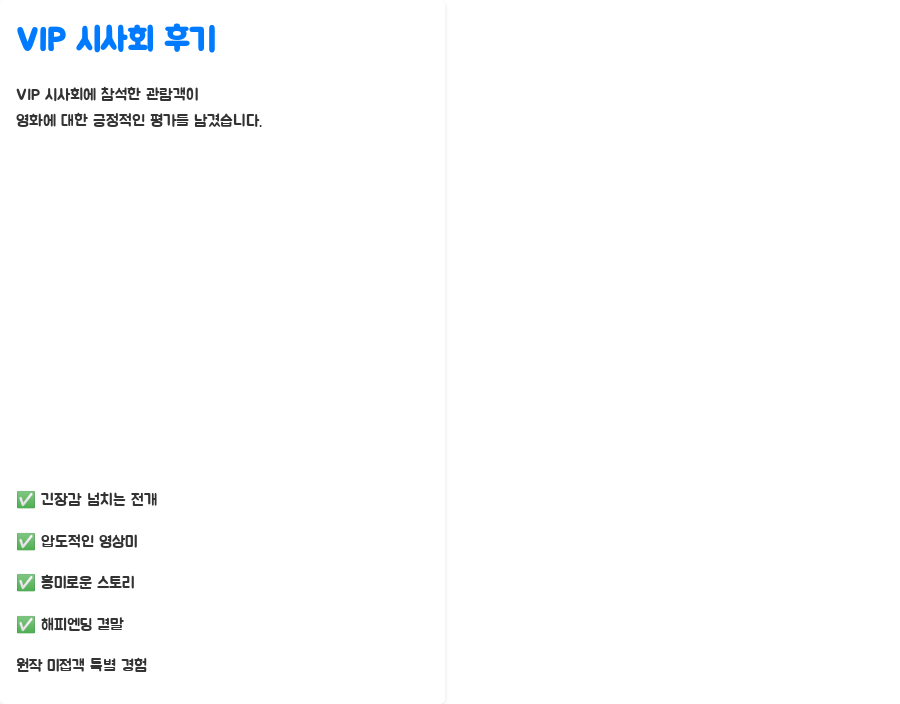 | VIP 시사회 후기 | 긍정적, 긴장감, 영상미, 흥미로운 스토리라인, 해피엔딩 느낌 |