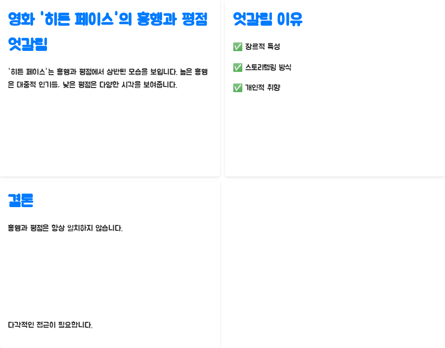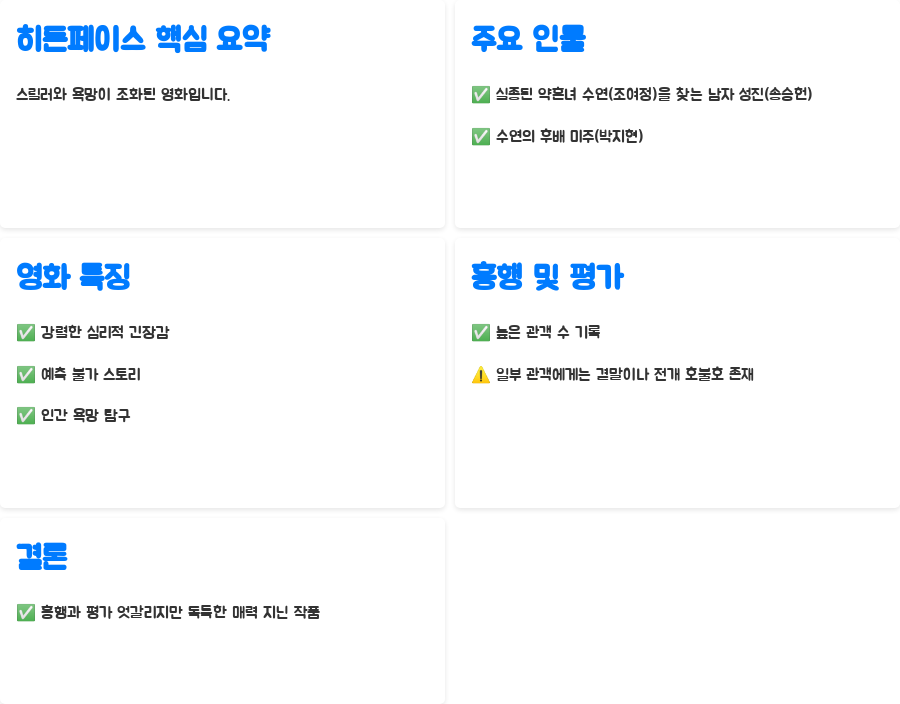 결국, '히든 페이스'는 흥행과 평점의 엇갈림 속에서도 독특한 매력을 지닌 작품임을 분명히 보여줍니다.