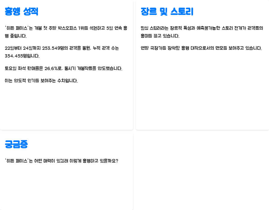 Q1. 히든 페이스의 흥행 요인은 무엇인가요?