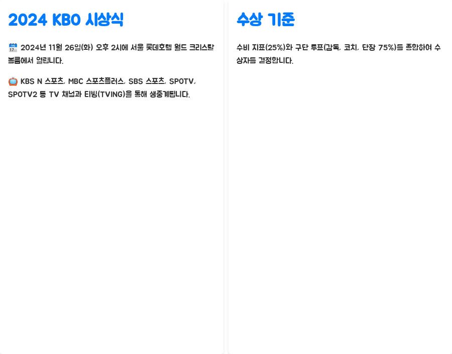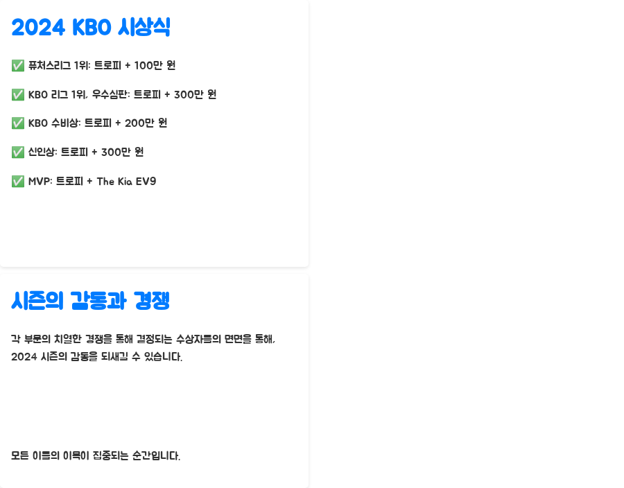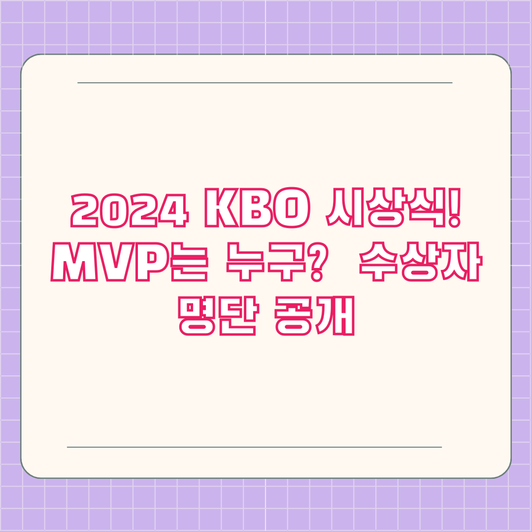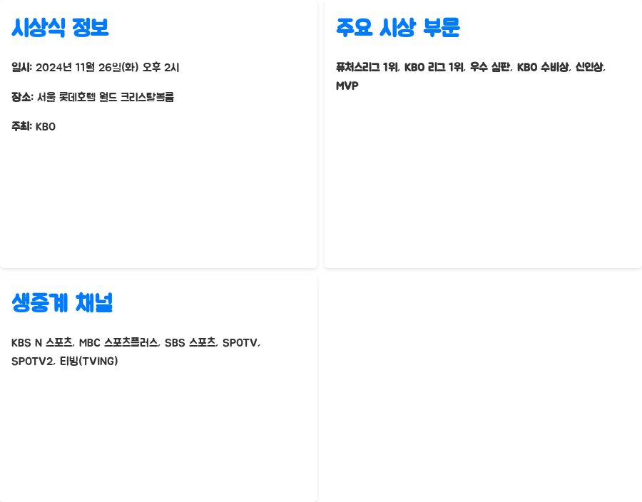 KBO가 주최하는 이 시상식은 2024 시즌 최고의 활약을 펼친 선수들과 관계자들을 축하하는 자리로, 한 해 동안의 열정과 노력을 기념하는 뜻깊은 시간이 될 것입니다.