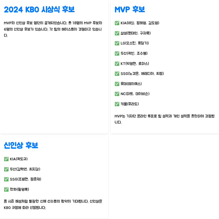 2024 KBO 시상식의 백미라 할 수 있는 MVP와 신인상 후보 명단 또한 공개되었습니다. 총 18명의 선수가 MVP 후보에 올랐으며, KIA(네일, 정해영, 김도영), 삼성(원태인, 구자욱), LG(오스틴, 홍창기), 두산(곽빈, 조수행), KT(박영현, 로하스), SSG(노경은, 에레디아, 최정), 롯데(레이예스), NC(하트, 데이비슨), 키움(후라도) 등 각 팀의 에이스들이 치열한 경쟁을 펼치고 있습니다.