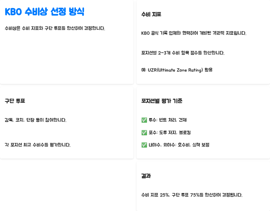KBO 수비상은 단순히 눈에 보이는 기록만으로 판단하는 것이 아닙니다. 수비 지표 25%와 구단별 투표 75%를 합산하여 최종 수상자를 선정합니다. 구단별 투표에는 감독, 코치, 단장이 참여하며, 각 포지션에서 가장 뛰어난 수비력을 보여준 선수를 엄격하게 평가합니다.