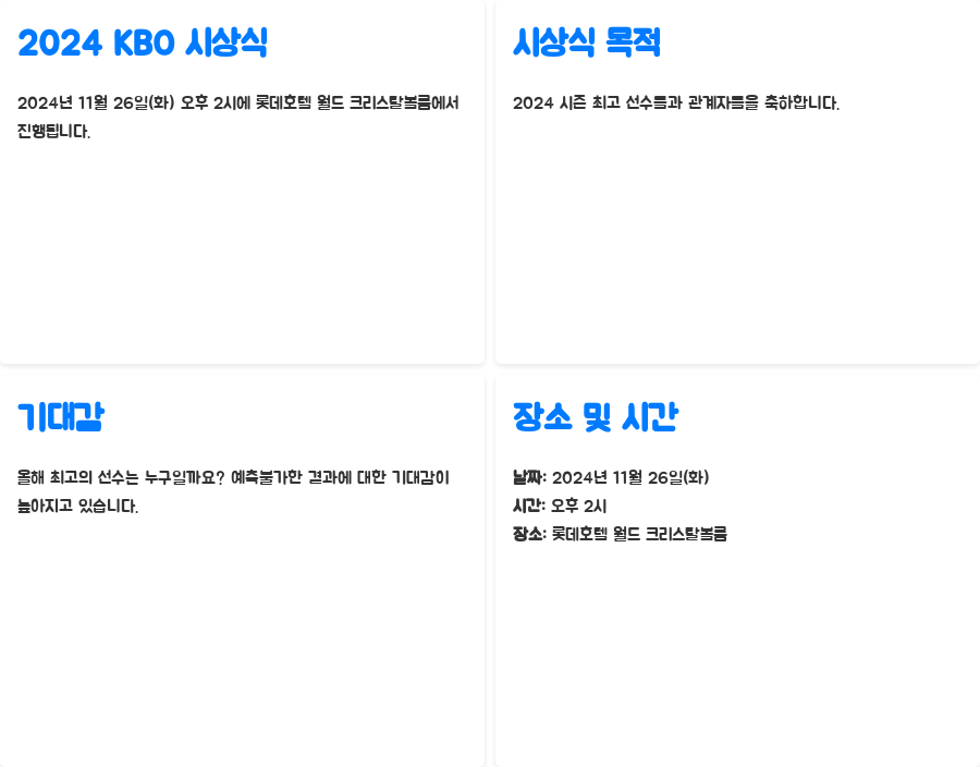 11월 26일 오후 2시, 서울 롯데호텔 월드 크리스탈볼룸에서 펼쳐지는 2024 KBO 시상식에 많은 관심과 응원 부탁드립니다! 오늘 알아본 내용 어떠셨나요? 다른 흥미로운 KBO 관련 포스팅도 많으니, 블로그 구독을 통해 더 많은 정보를 얻어가세요!