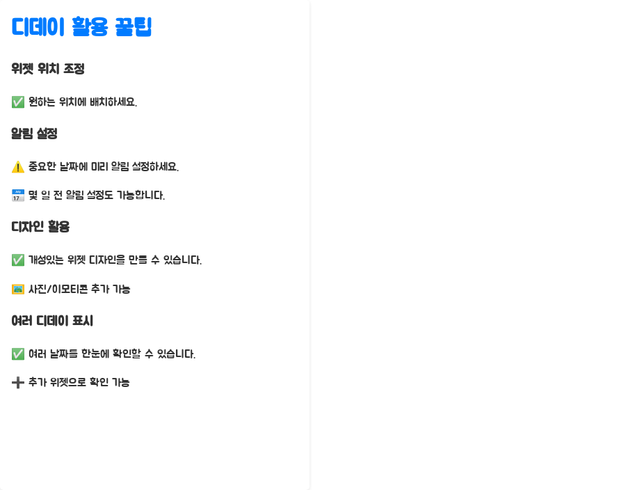 - 여러 디데이 동시 표시: 여러 개의 디데이 위젯을 추가하여 더 많은 중요한 날짜를 한눈에 확인할 수 있습니다.