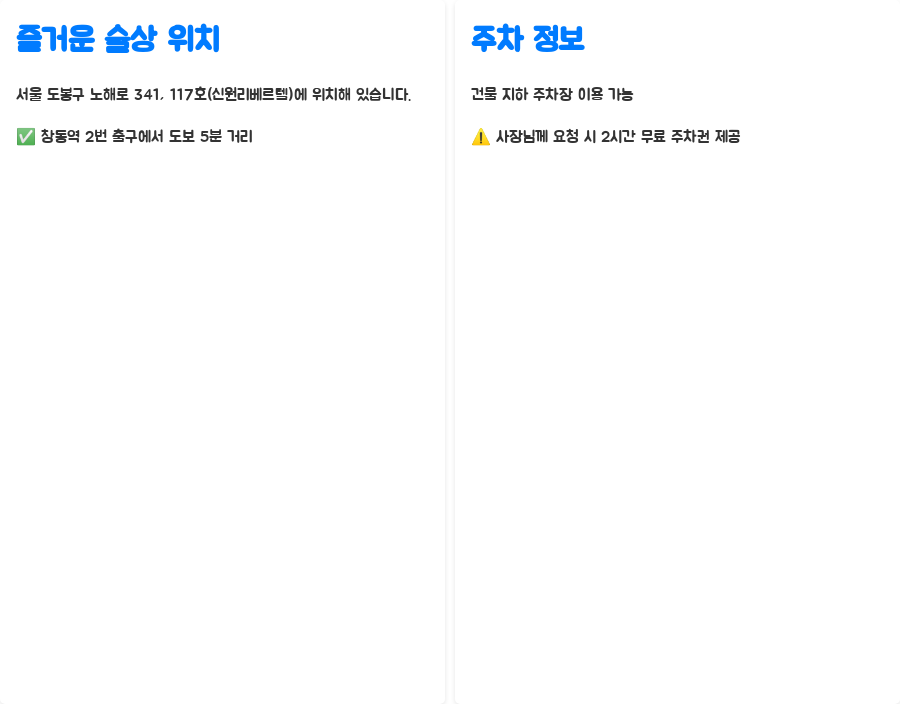 | 위치 | 서울 도봉구 노해로 341, 117호 (신원리베르텔) |