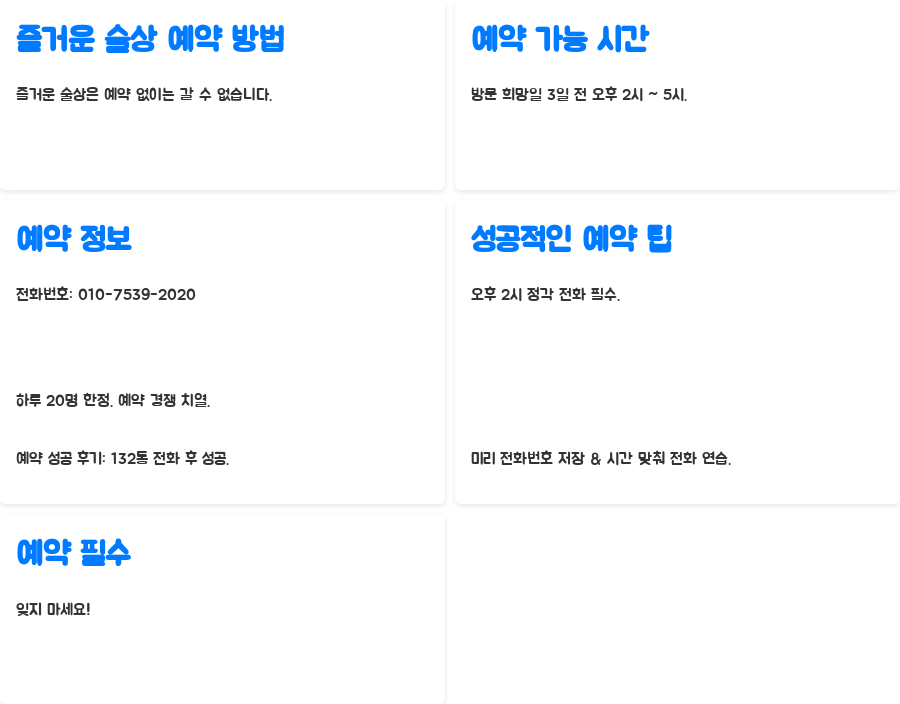 | 예약 방법 | 방문 3일 전 오후 2시~5시, 전화 예약 (010-7539-2020) |