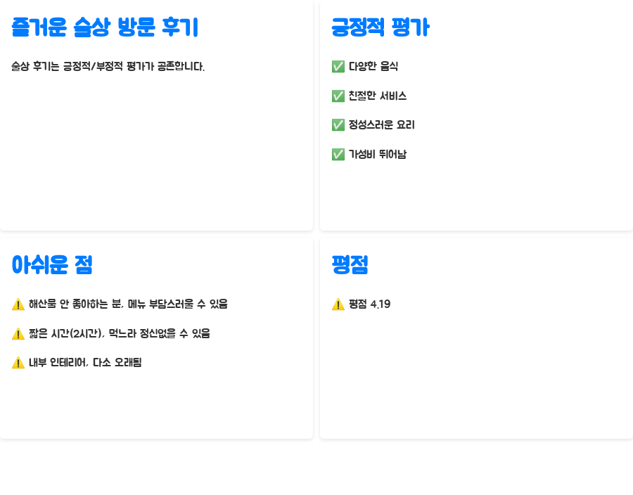 즐거운 술상 방문 후기: 극찬과 아쉬움이 공존하는 리뷰 분석