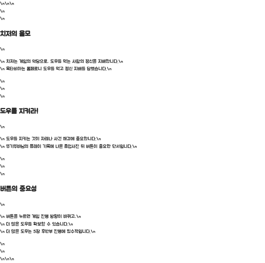 이 버튼을 누르는 행위는 게임의 진행 방향을 크게 바꾸는 중요한 역할을 하며, 이를 통해 더 도우를 확보할 수 있습니다. 더 도우를 획득하는 것은 5장의 후반부를 진행하는데 필수적입니다.