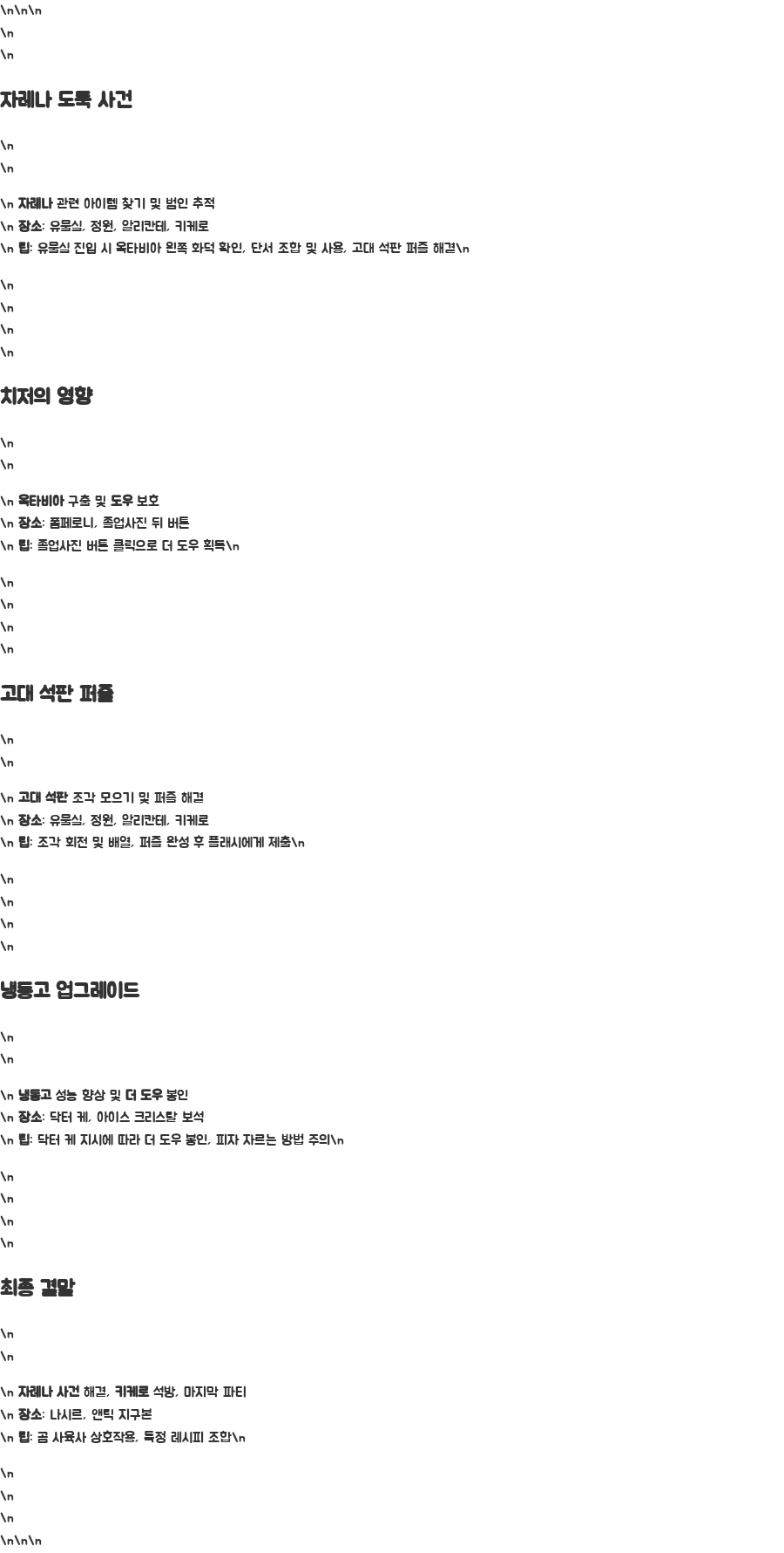 | 최종 결말 | 자레나 사건 해결, 키케로 석방, 마지막 파티 | 나시르, 앤틱 지구본 | 곰 사육사와의 상호작용, 특정 레시피 조합 |