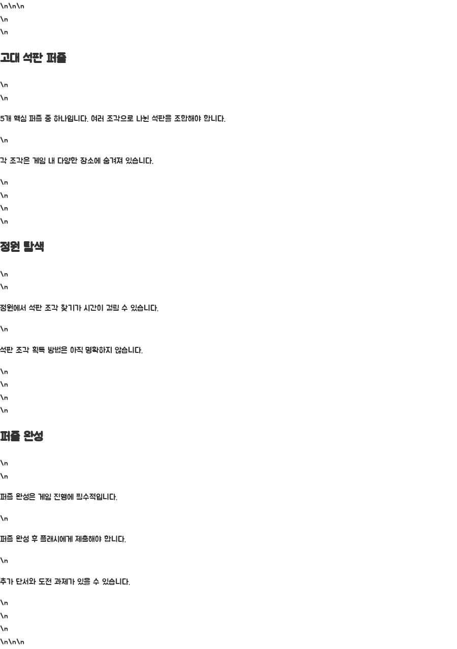 정원에서의 석판 조각 획득 방법은 아직 명확하게 밝혀지지 않았으므로, 인내심을 가지고 게임을 진행하는 것이 중요합니다. 퍼즐을 완성하는 것은 게임의 진행에 필수적인 요소이며, 퍼즐 완성 후에는 플래시에게 석판을 제출해야 합니다.