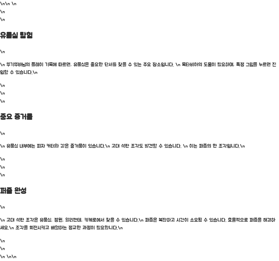 뚜기뚜바님의 플레이 기록에 따르면, 유물실은 중요한 단서를 찾을 수 있는 주요 장소 중 하나입니다. 유물실 진입은 옥타비아의 도움이 필요하며, 특정 그림을 누르는 것을 통해 진입할 수 있다고 합니다.