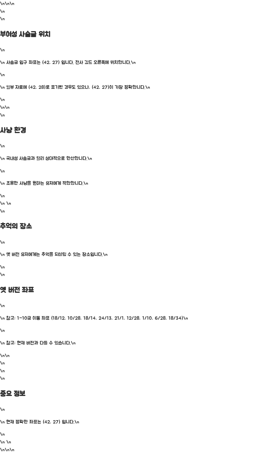 옛 버전의 사슴굴 정보를 찾는 분들께는 1~10굴까지의 이동 좌표 (18/12, 10/28, 18/14, 24/13, 21/1, 12/28, 1/10, 6/28, 18/34) 정보가 도움이 될 수 있습니다.